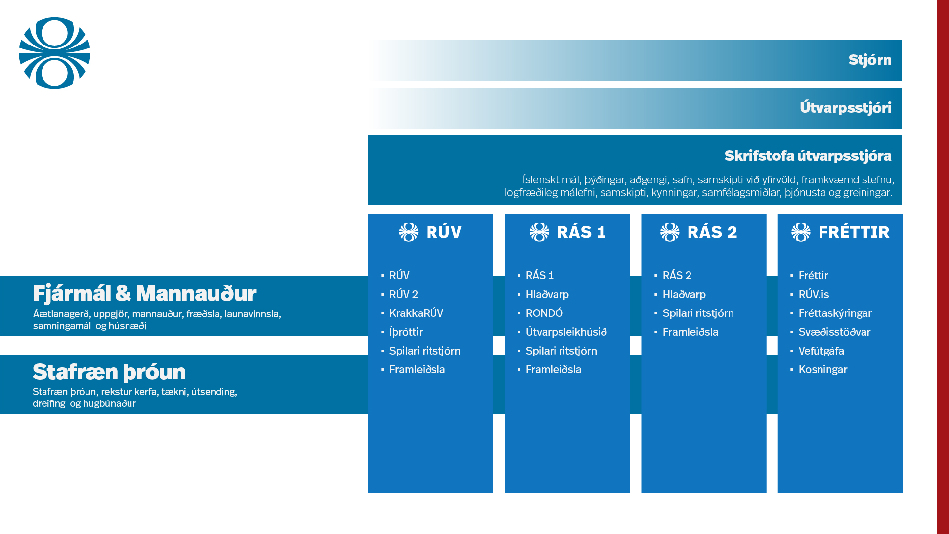 Stjórnskipulag RÚV er í stöðugri þróun. Breytingar eru gerðar til að styrkja dagskrárþróun, framleiðslu og miðlun til stafrænnar framtíðar. Nýtt skipurit var kynnt 2025.